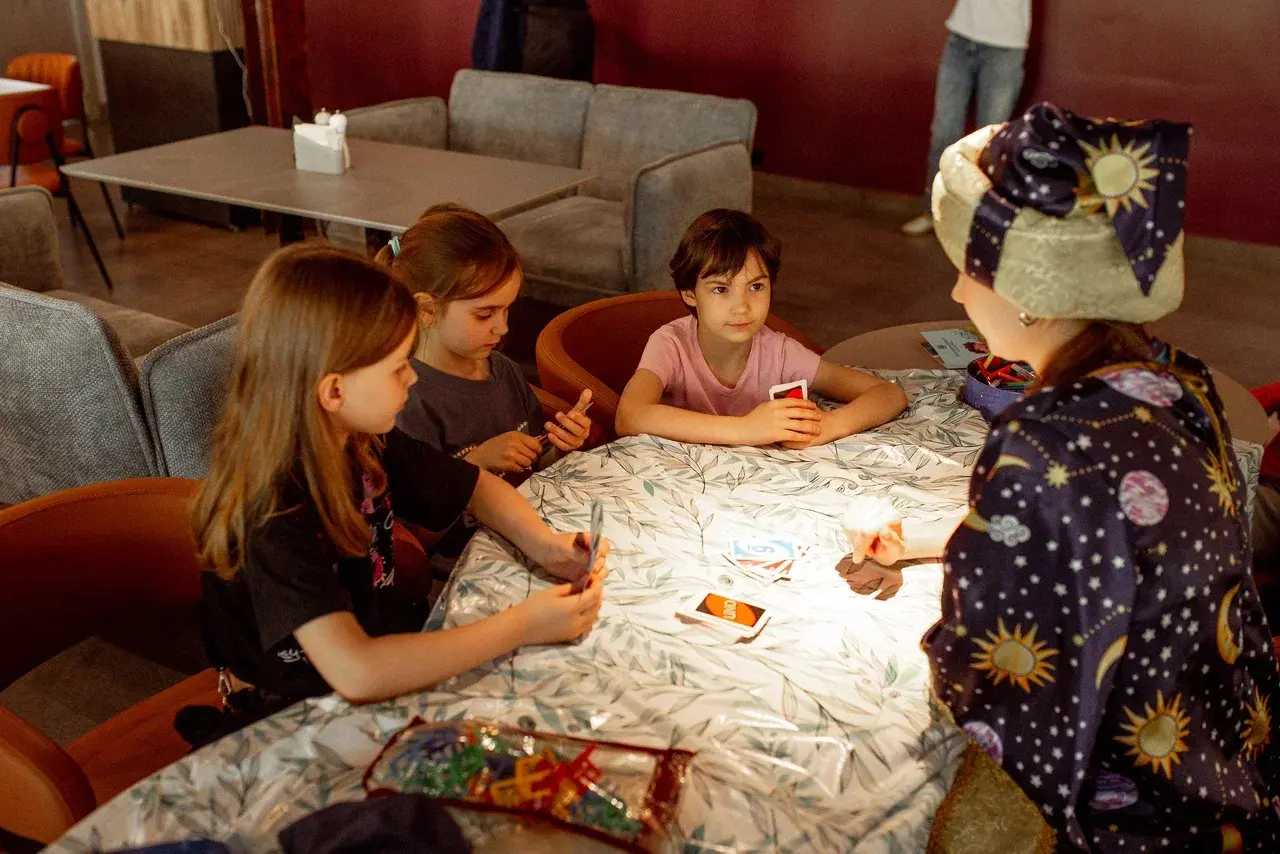 Для ребят — игры, творческие задания, лёгкие развивающие активности и весёлое настроение. Пока дети увлечены, взрослые могут спокойно наслаждаться выходным и вкусным обедом.